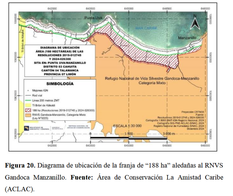 The core of the current conflict in the Gandoca-Manzanillo National Wildlife Refuge is the identification of 107.9 hectares of primary and secondary forest that have been left in a state of legal vulnerability. The direct cause of this lack of protection is the approval of Law No. 9223 in 2014, which, in an attempt to solve a long-standing land tenure problem, generated an uncontrolled side effect. The main consequence is the creation of a legal vacuum that weakens the State’s ability to prevent deforestation and regulate development on these lands, which are now in the process of being titled as private property.