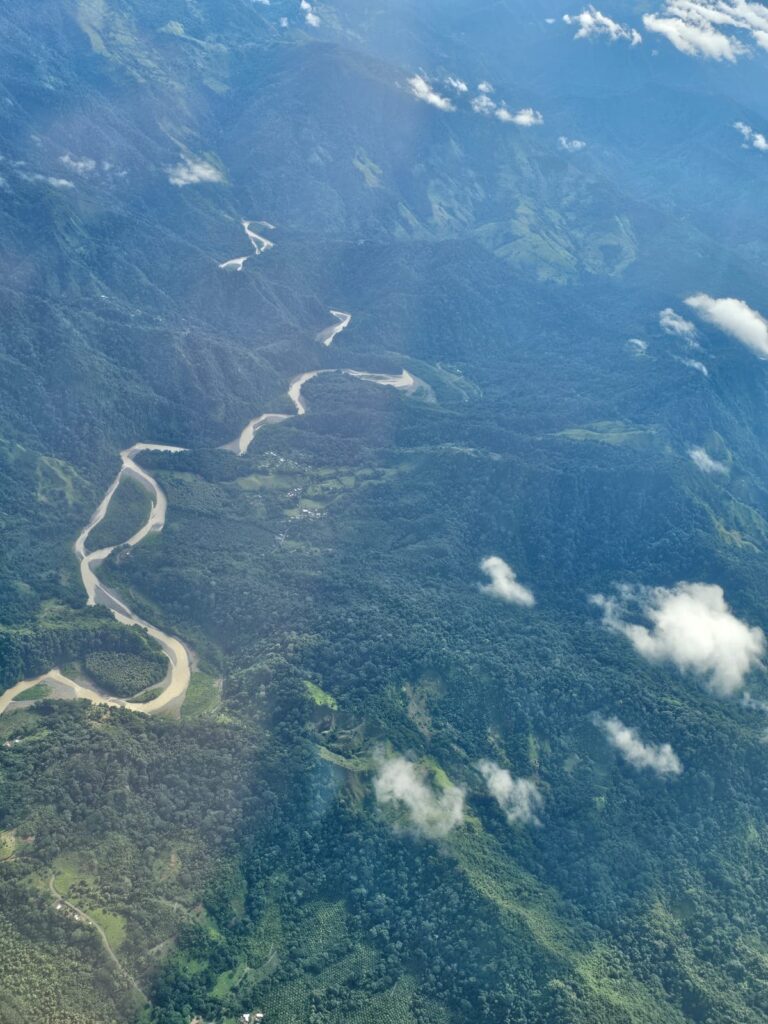 El avión atraviesa montañas, valles y cañones, sobrevuela plantaciones, meandros y ríos. Desde arriba se distinguen casas dispersas, escena típica de los pueblos ticos. Poco a poco el relieve se aplana y los ríos comienzan a abrirse en deltas que desembocan en el Pacífico Central.