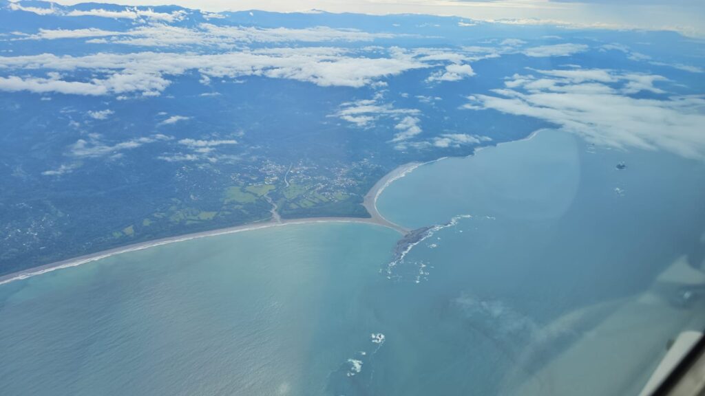 El piloto y su primer oficial anuncian el paso sobre Quepos: cielos despejados, sin otras aeronaves a la vista. Me sorprenden las aguas del Pacífico: claras, verdes y azules, con poco oleaje. Es invierno y agosto había traído lluvias intensas, así que esperaba costas turbias por los sedimentos, pero la realidad era bastante clara.